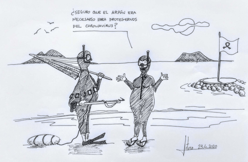 Julio de dos mil veinte, ¡por fin salimos de casa! Qué negativa es la gente que no cree que todo pasa Me convenció mi parienta pa' bajarnos a la playa ¡Vaya tarde más cruenta, vaya experiencia canalla! Lo que antes era un goce, se convirtió en un suplicio, y sabe quién me conoce que yo no me quejo de vicio: Las toallas a tres metros, ir a bañarse por turnos, y cómo me tomo un espeto con este traje de buzo Si hubiera entrenado duro y hubiera comido menos, ahora estoy casi seguro que me entraría el neopreno Con las gafas de buceo, las aletas y este traje, sinceramente no creo que yo otra tarde me baje. Y echo de menos un poco los ratos de playa de antes, cuando andabas como un loco buscando dónde sentarte, ... ahora que ya ni te toco ni puedo tampoco abrazarte, y en la toalla me enroco si no puedo acompañarte.